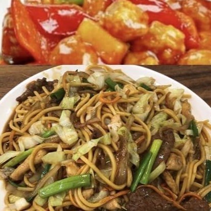 Yakissoba simples 500ml ,com frango agridoce-( feito com Coxa de frango empanado,com cebola,pimentão,tomate,abacaxi ao molho agridoce),em uma marmita 750ml