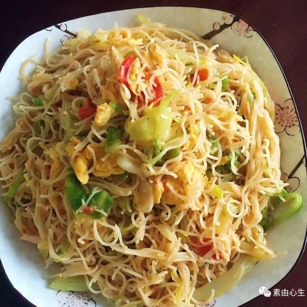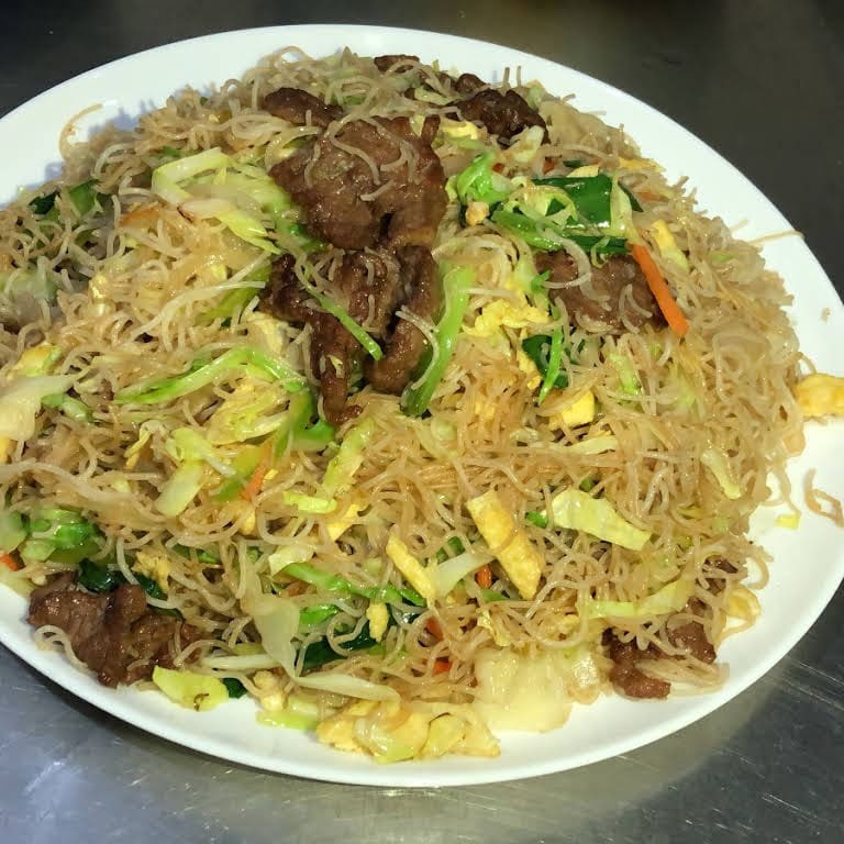 Ovo e macarrão de arroz,carne,cebola,repolho,cenoura,pimemtão com molho de soja frito na wok (padrão-1100ml-serve 2 pessoas)