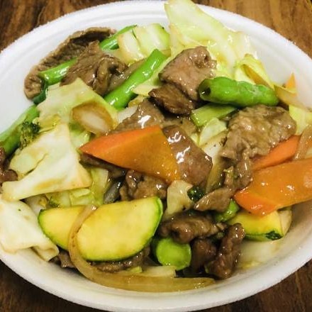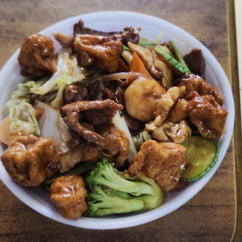 Tofu em cubos frito, cebola ,cogumelo,cenoura,brócolis,vagem,repolho,acelga ao molho especial