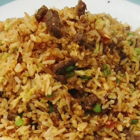 Arroz com ovo,carne,cenoura,cebolinha com molho de soja na wok