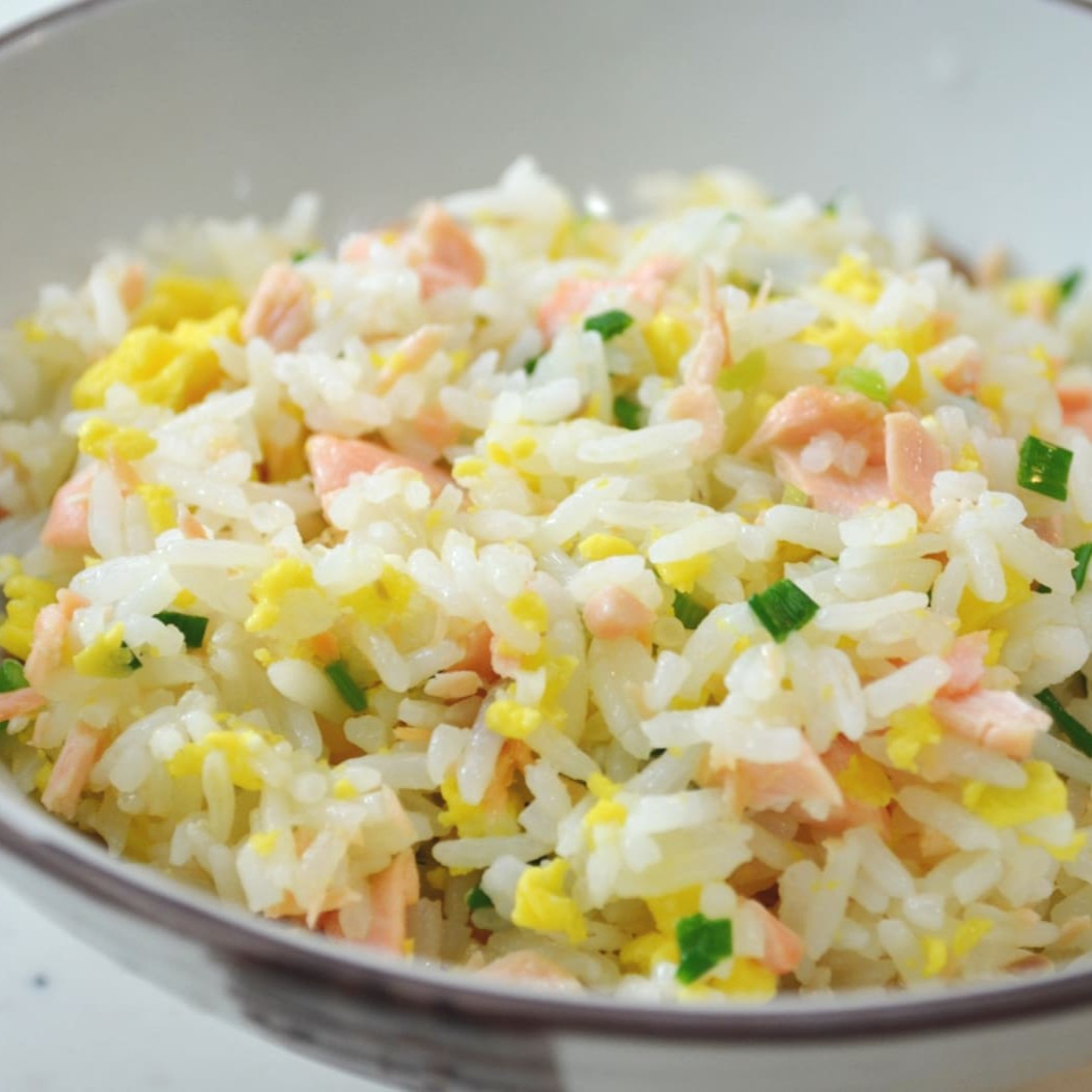 Arroz com ovo,salmão,cenoura,cebolinha com molho de soja na wok