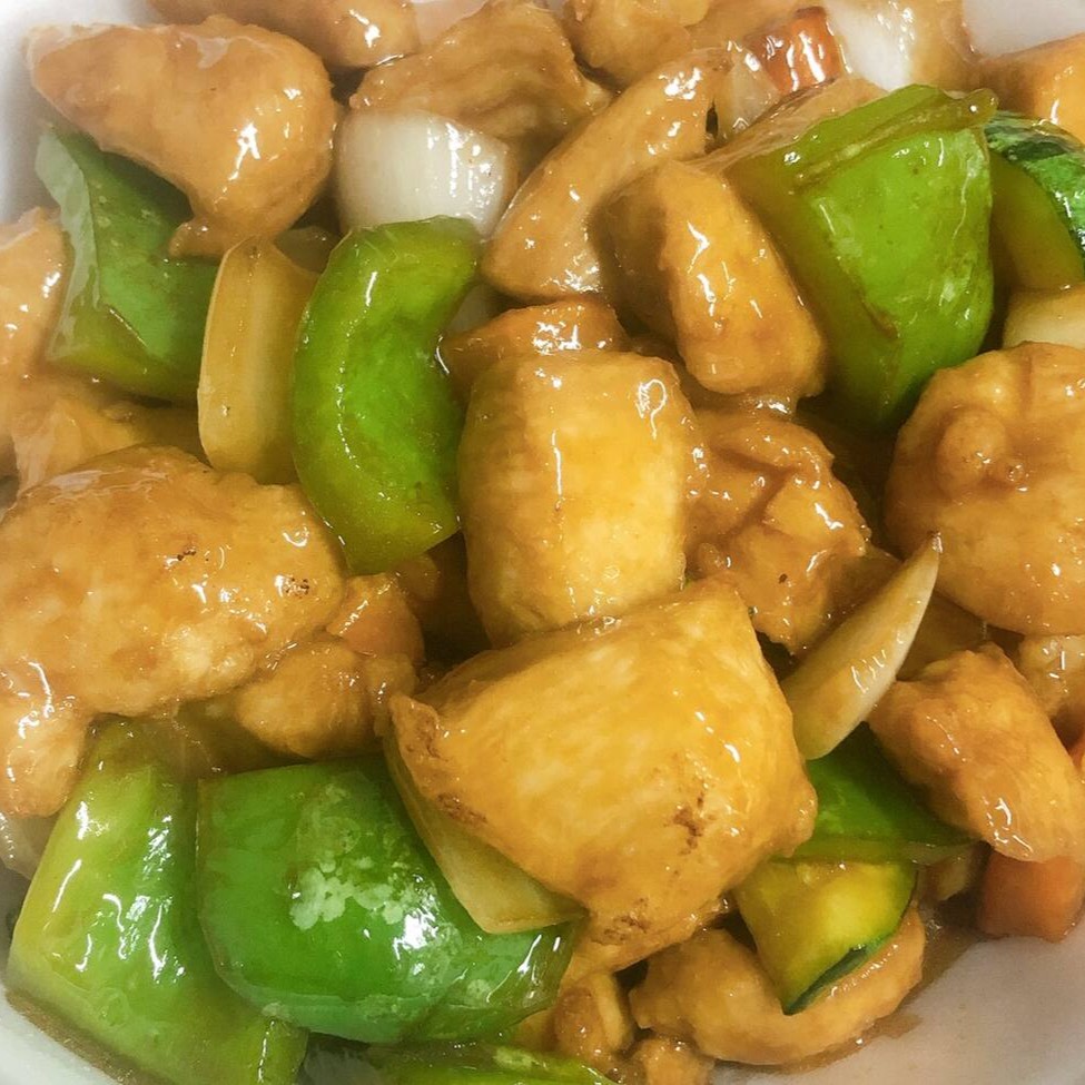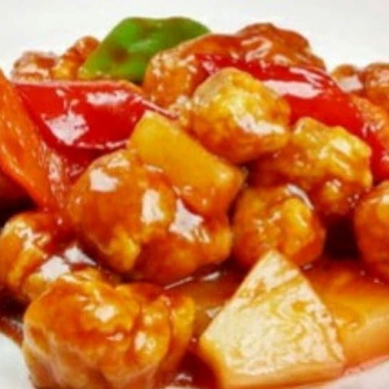 Lombo de porco,com cebola,pimentão,tomate,abacaxi ao molho agridoce