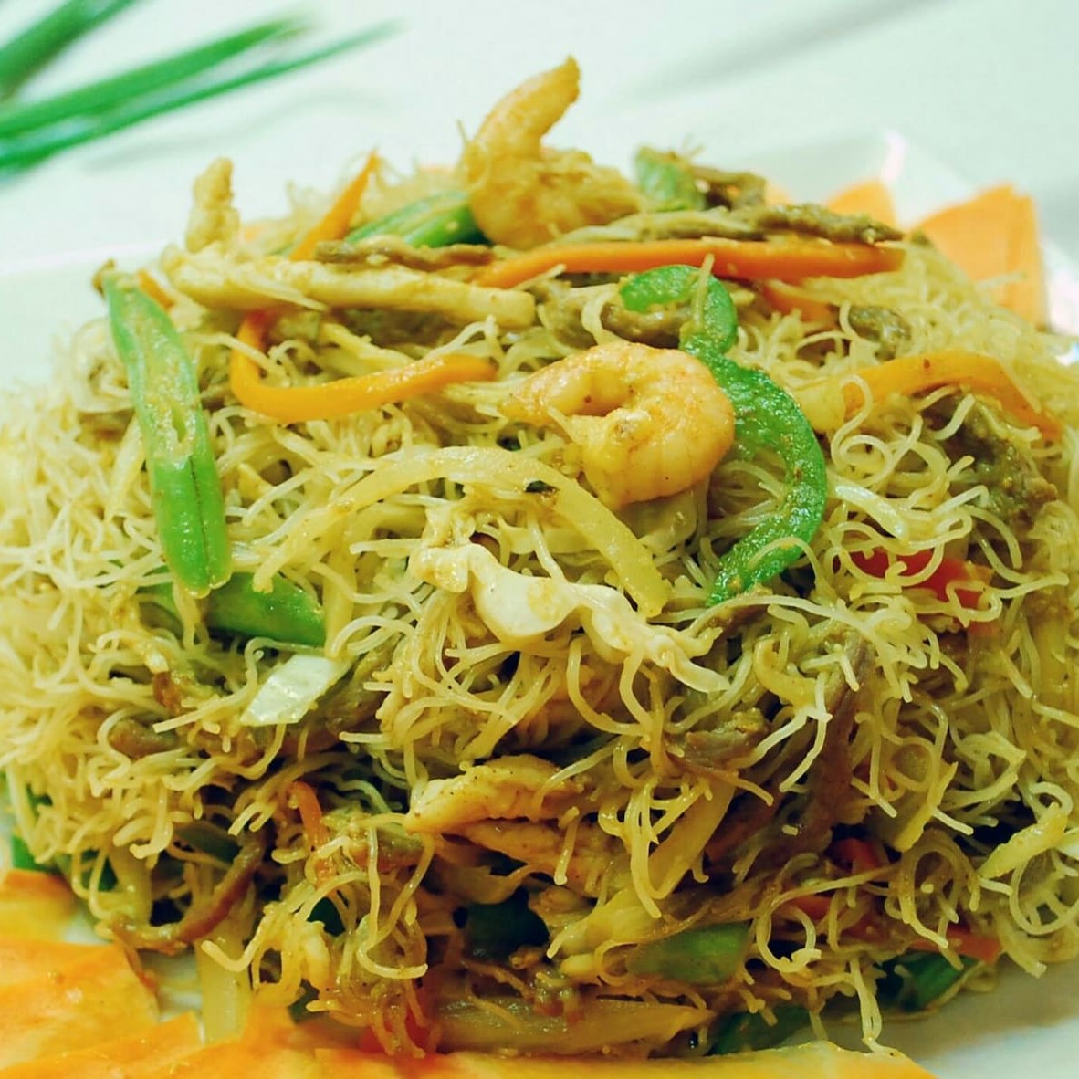 Ovo e macarrão de arroz,carne,frango,cebola,repolho,cenoura,pimemtão com molho de soja frito na wok (padrão-1100ml-serve 2 pessoas)