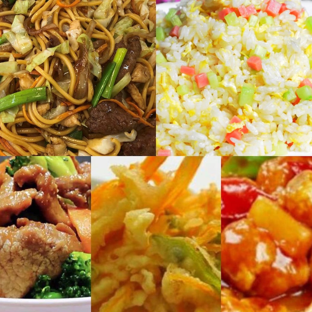 ( carne com brócolis 750ml) + ( frango agridoce 750ml)+ (6 tempura de legumes)+ (escolha yakimeshi ou yakissoba 1100ml).