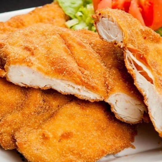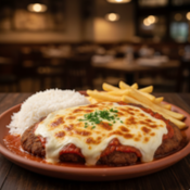 Filet de frango com tempero especial empanado em ovos frescos e farinha de rosca caseira coberto com mussarela e molho de tomate especial acompanha arroz, feijão.