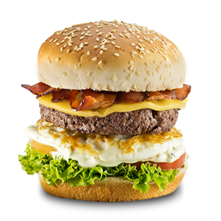 Hambúrguer, calabresa, bacon ,ovo, queijo , presunto ,file de frango a milanesa alface tomate maionese pão de hambúguer