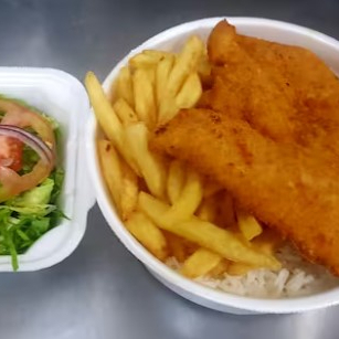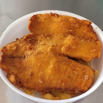 Filé de Tilapia fresquinha ã parmegiana acompanhada de arroz branco, feijão, batata frita e salada.