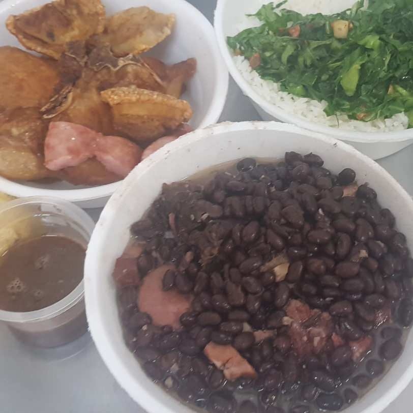 Sucesso de venda!!!. - feijoada (costelinha suína, carne seca e linguiça), arroz branco, couve na manteiga, farofa, molho apimentado, torresmo e duas bistecas suína bem fritinha. (serve bem duas pessoas).