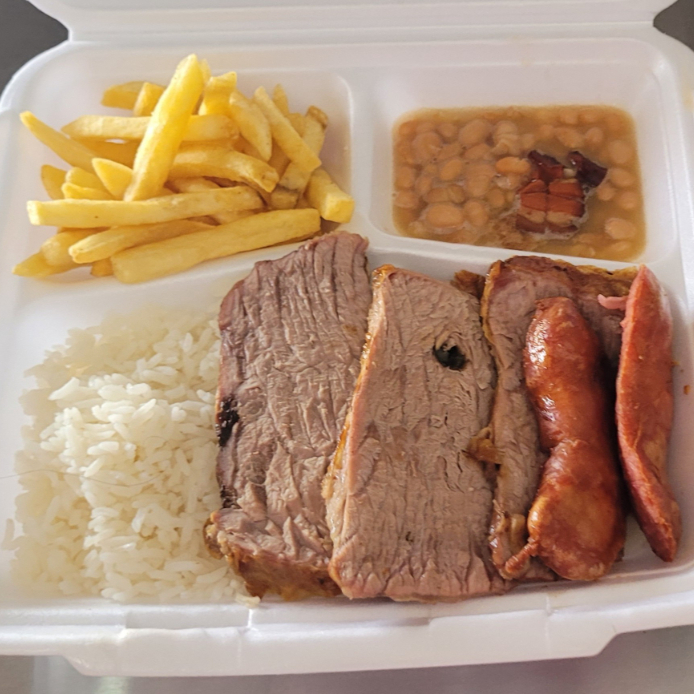 Carne assada (maminha) com linguiça, arroz branco, feijão, batata frita e salada..