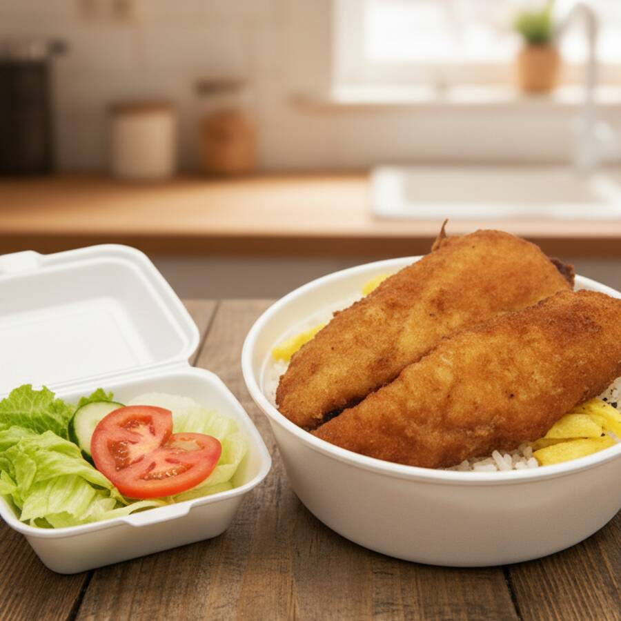 Delicioso Filé de Merluza à milanesa acompanhado de arroz branco, feijão, batata frita e salada..