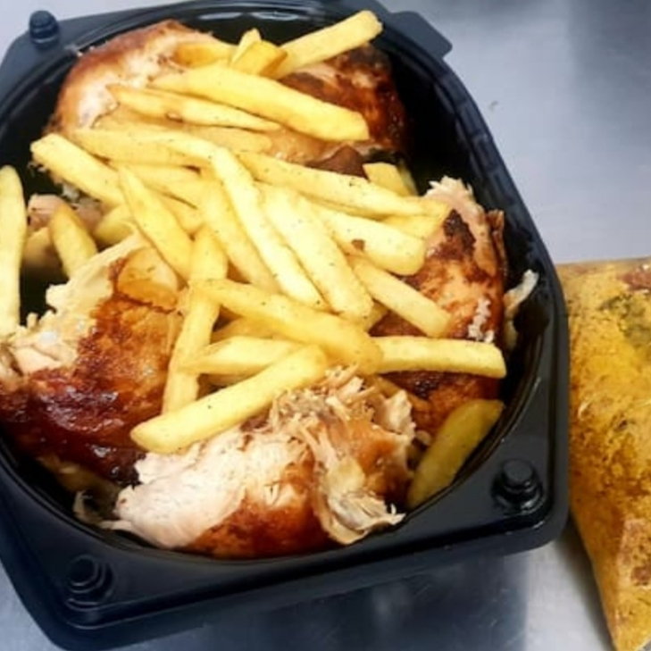 Delicioso Frango Assado de Padaria acompanhado de batata frita. (favor colocar na observação se o mesmo deve ser cortado ou enviado inteiro).