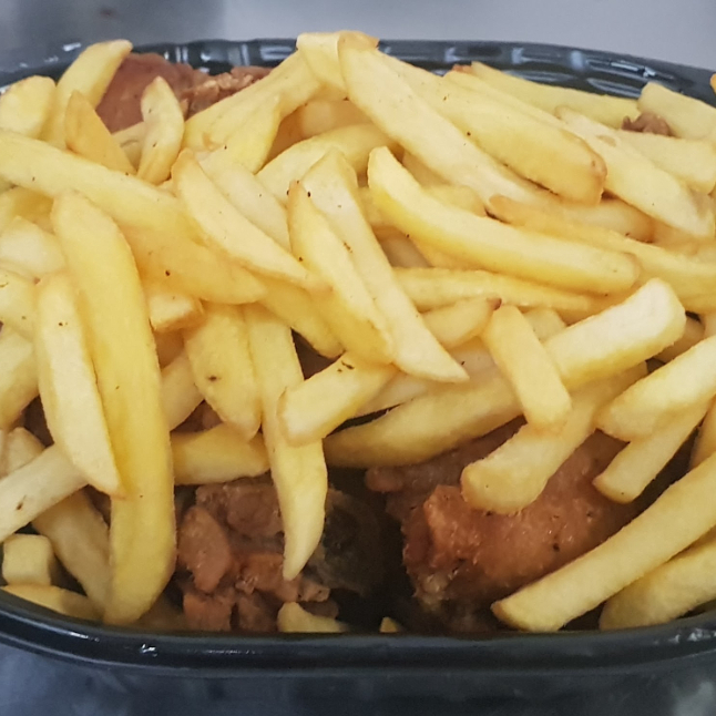 Deliciosa porção de Frango à passarinho bem crocante e fresquinho acompanhado de batata frita (~800g).