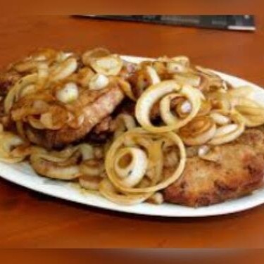 Arroz, feijão, farofa, salada do dia e Bisteca acebolada