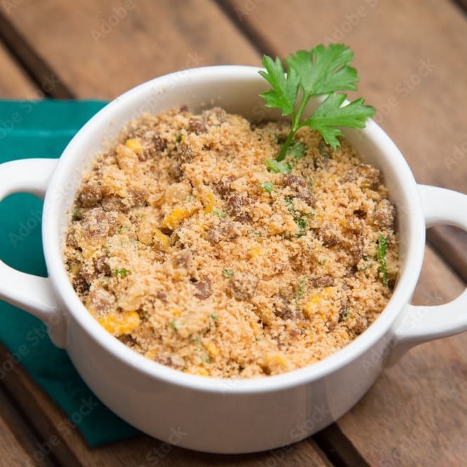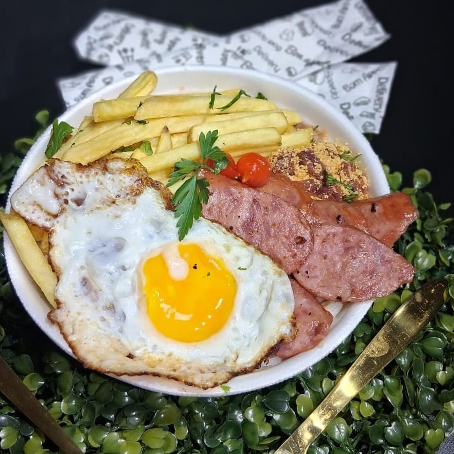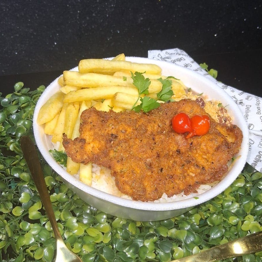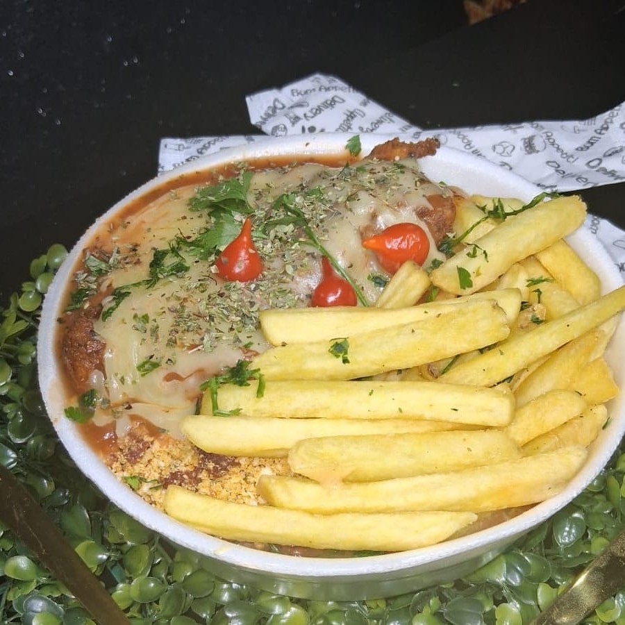 O prato é composto por Bife empanado crocante, acompanhada de arroz soltinho, feijão carioca, batatas fritas crocantes e uma farofa temperada, oferecendo uma refeição saborosa e cheia de personalidade. Uma combinação simples, mas irresistível.