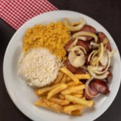 Calabresa acebolada, servida com arroz branco soltinho, feijão carioca temperado, batata frita crocante e farofa crocante na medida certa. Uma refeição caseira, saborosa e que acalenta a alma. Perfeita para quem deseja um prato completo, simples e cheio de sabor!