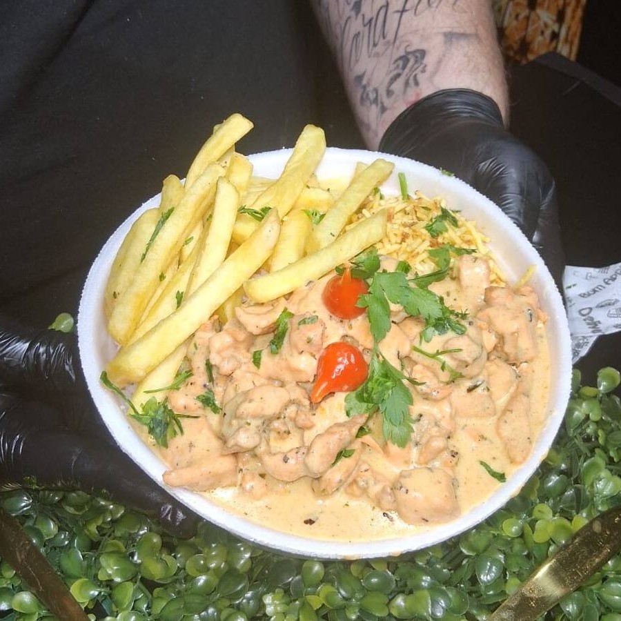 Strogonoff cremoso de frango, arroz branco soltinho, batata frita crocante e batata palha. Uma combinação perfeita para seu almoço!