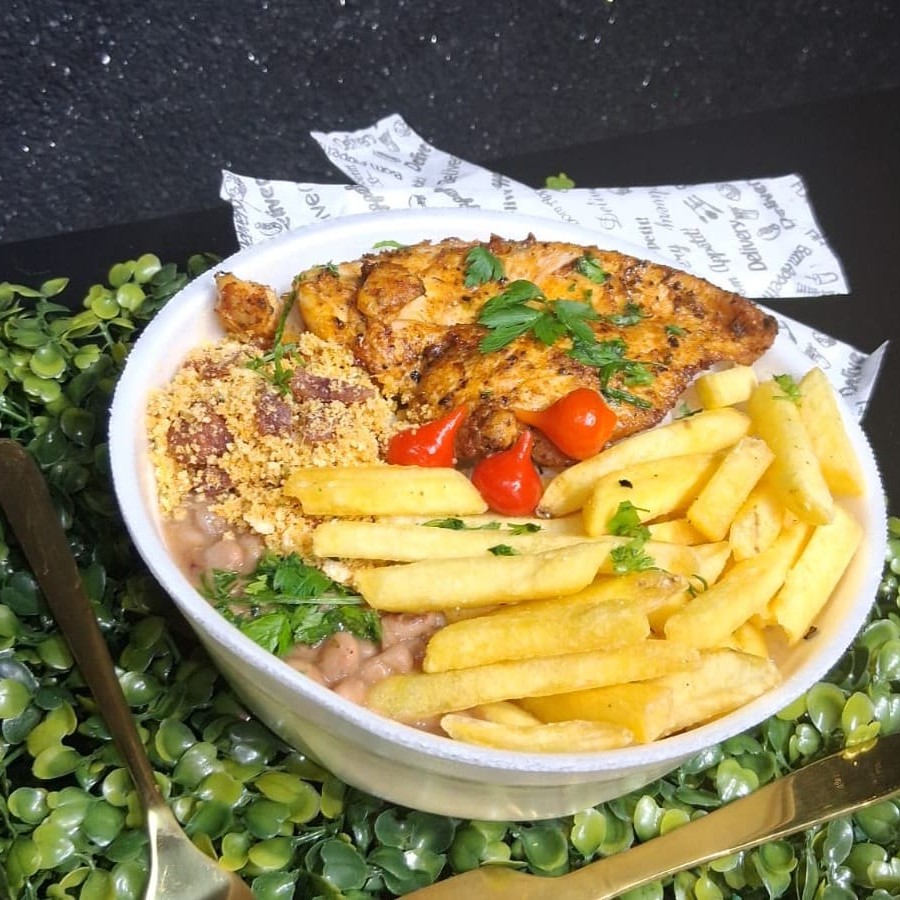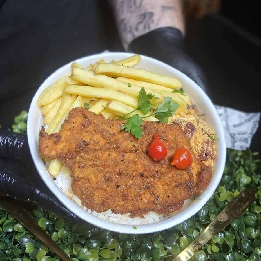 O prato é composto por filé de frango empanado crocante, acompanhada de arroz soltinho, feijão carioca, batatas fritas crocantes e uma farofa temperada, oferecendo uma refeição saborosa e cheia de personalidade. Uma combinação simples, mas irresistível.