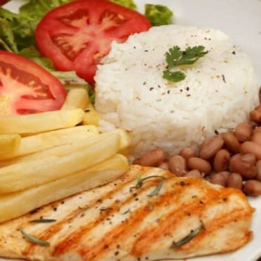 Filé de frango suculento grelhado no ponto, acompanhado de arroz branco soltinho, feijão carioca cremoso, batata frita crocante e farofa temperada. Uma refeição equilibrada e cheia de sabor!