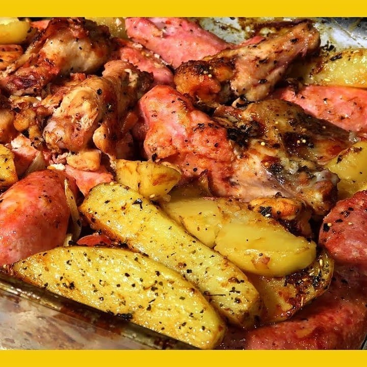 Frango assado na brasa, douradinho e suculento, com linguiça toscana, acompanha arroz soltinho, feijão caseiro, macarrão, alface e vinagrete fresco. Uma marmitex completa e deliciosa, com aquele gostinho irresistível de churrasco!