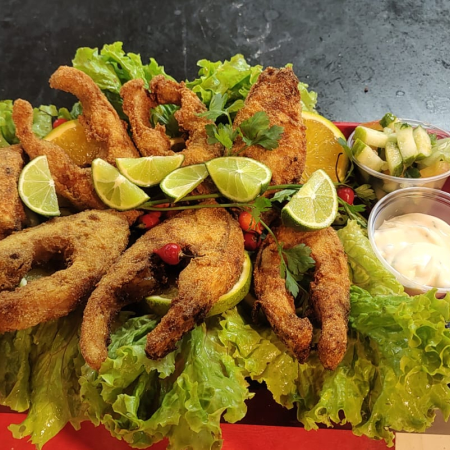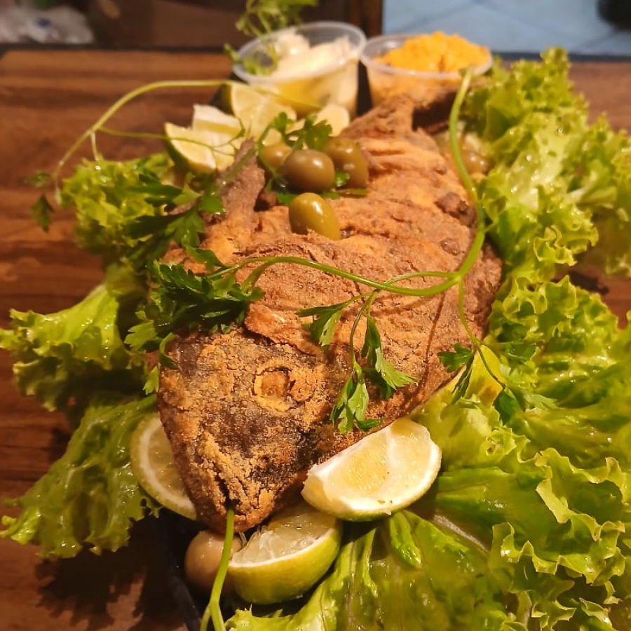 Tilápia inteira frita, dourada por fora e suculenta por dentro, com sabor marcante. Acompanhada de arroz soltinho e vinagrete fresco com tomate e cebola bem equilibrados. Finalizado com farofa crocante, trazendo textura e complemento perfeito ao prato.