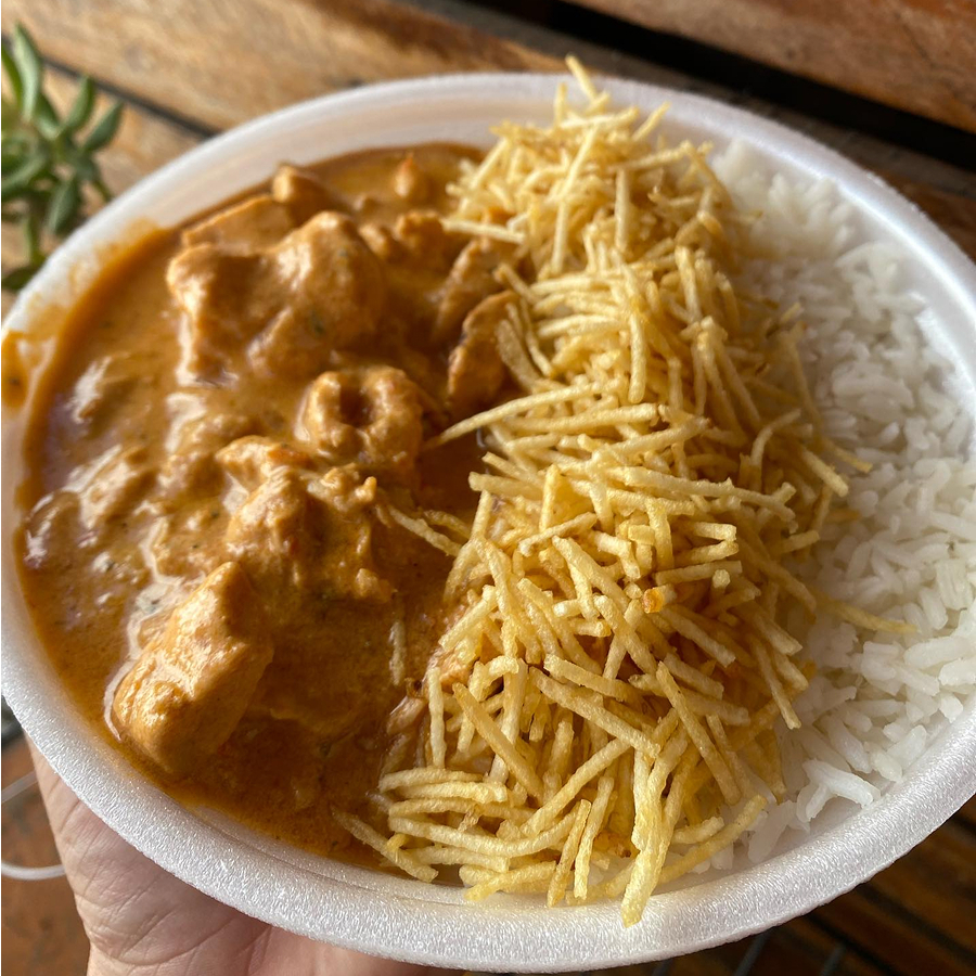 Strogonoff cremoso de frango acompanhado de arroz soltinho, feijão fresquinho, batata palha crocante e uma saladinha de alface com vinagrete para completar o sabor. Uma refeição completa, saborosa e feita na medida certa!