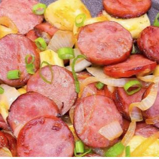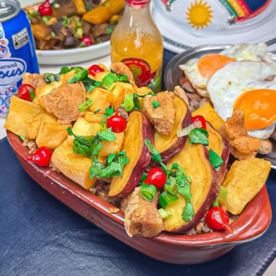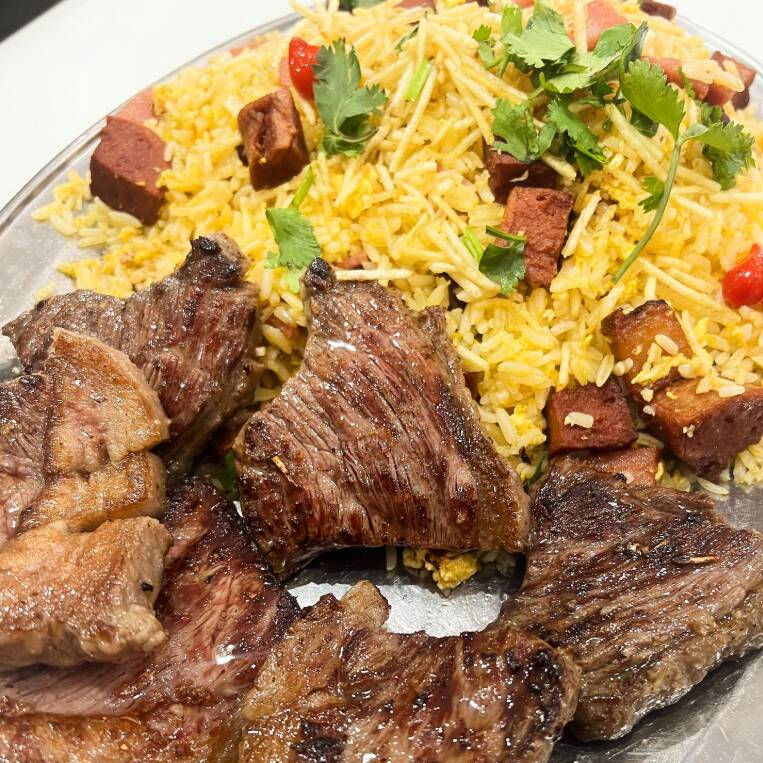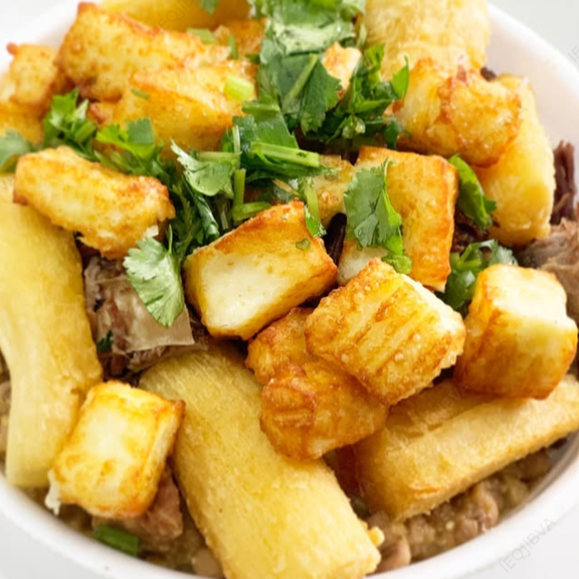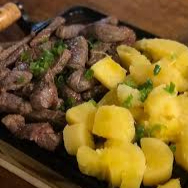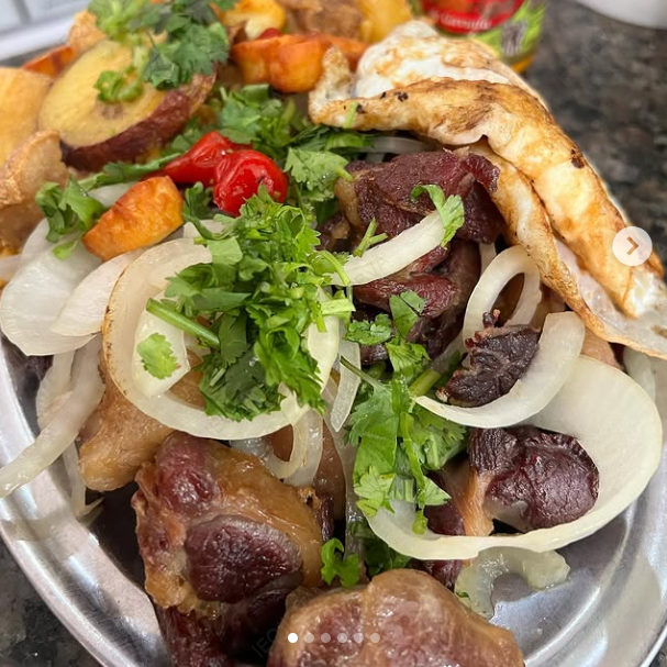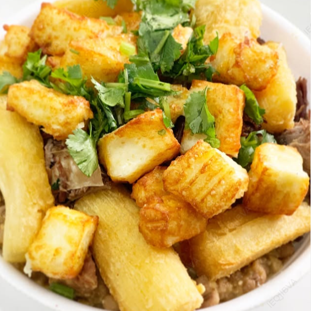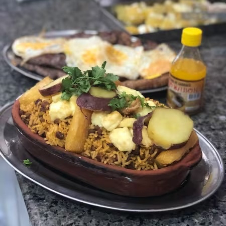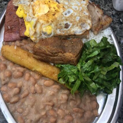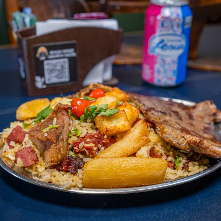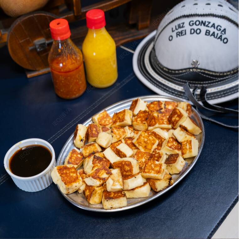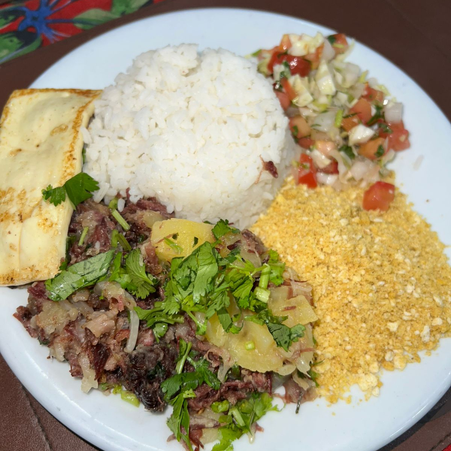 Carne seca acebolada puxada na manteiga acompanhada de macaxeira macia cozida no ponto certo, arroz e farofa crocante. Finalizado com uma fatia irresistivel de queijo coalho por cima.