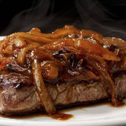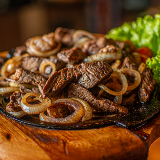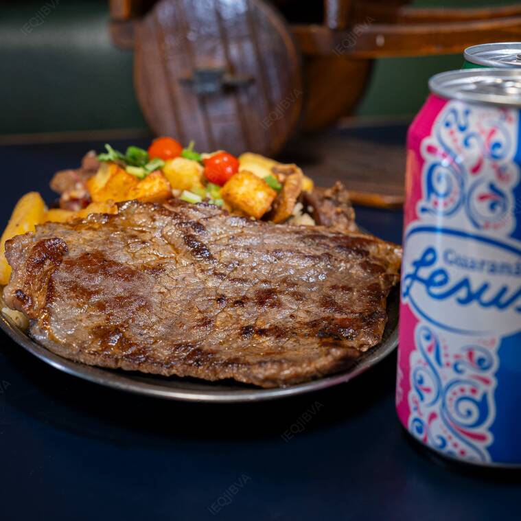 Prato individual. Bife de sol aperitivo acebolado, acompanhado de arroz, feijão, farofa, vinagrete fresquinho e finalizado com uma deliciosa fatia de queijo coalho.