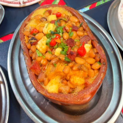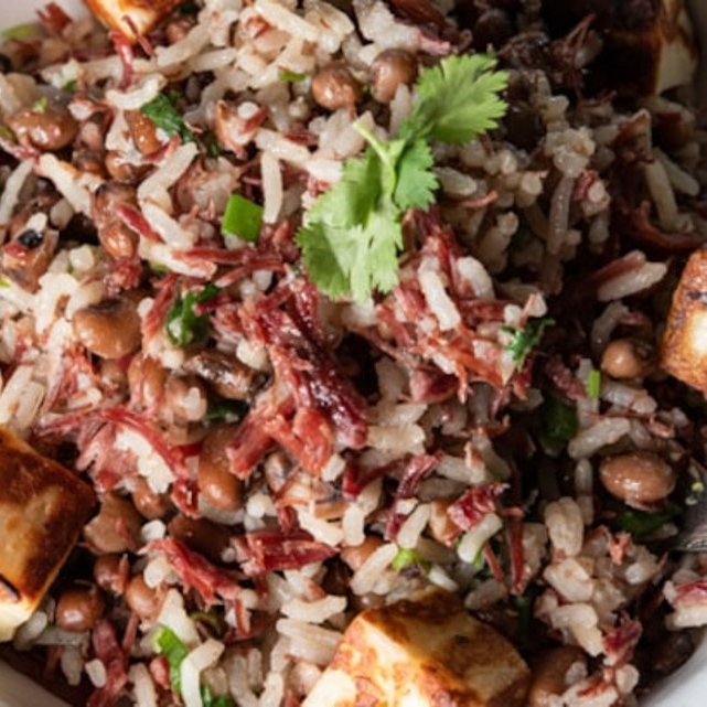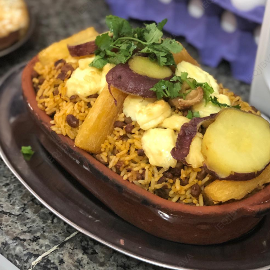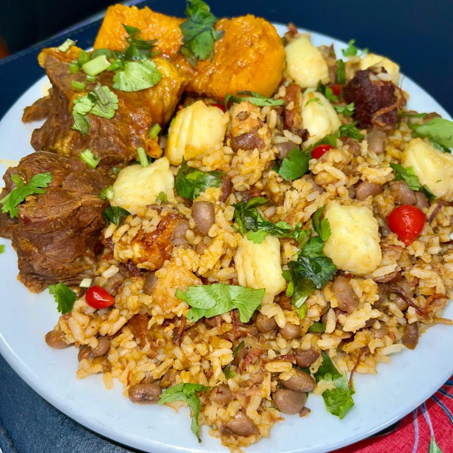 (feijão de corda farofado com manteiga de garrafa, com bacon, linguiça calabresa, carne seca, mandioca, queijo coalho e coentro)