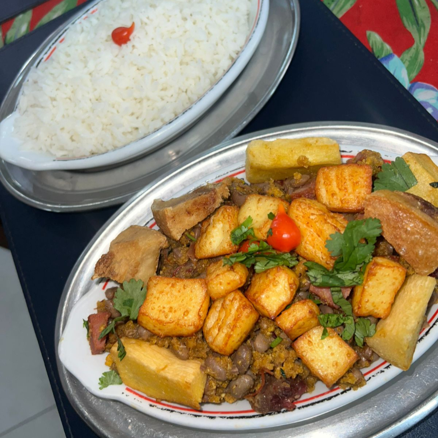 Feijão de corda puxado na manteiga de garrafa com farinha de mandioca (farofado), com bacon, linguiça, queijo coalho e mandioca frita por cima, acompanha uma guarnição de arroz.