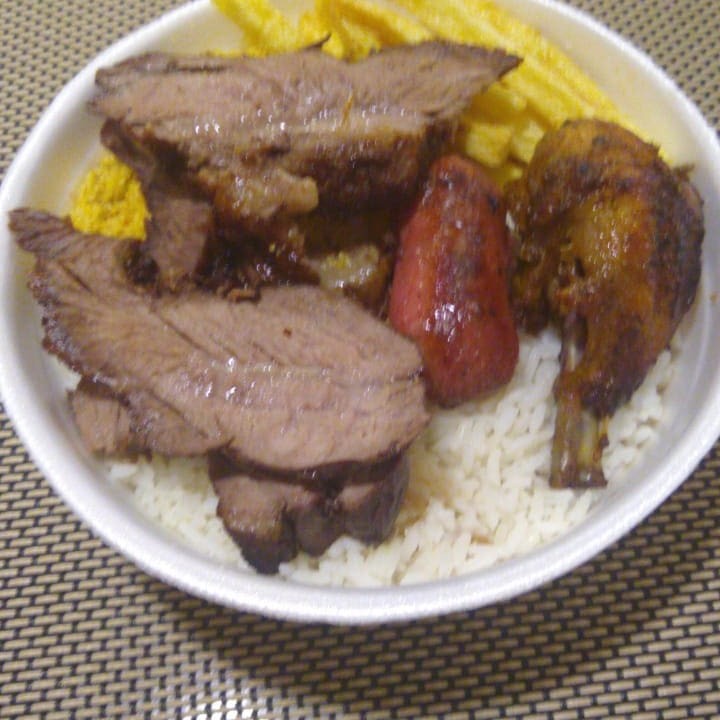 (+-700gr).2 coxas de frango, 2 linguiças, fritas, arroz, feijão e farofa.