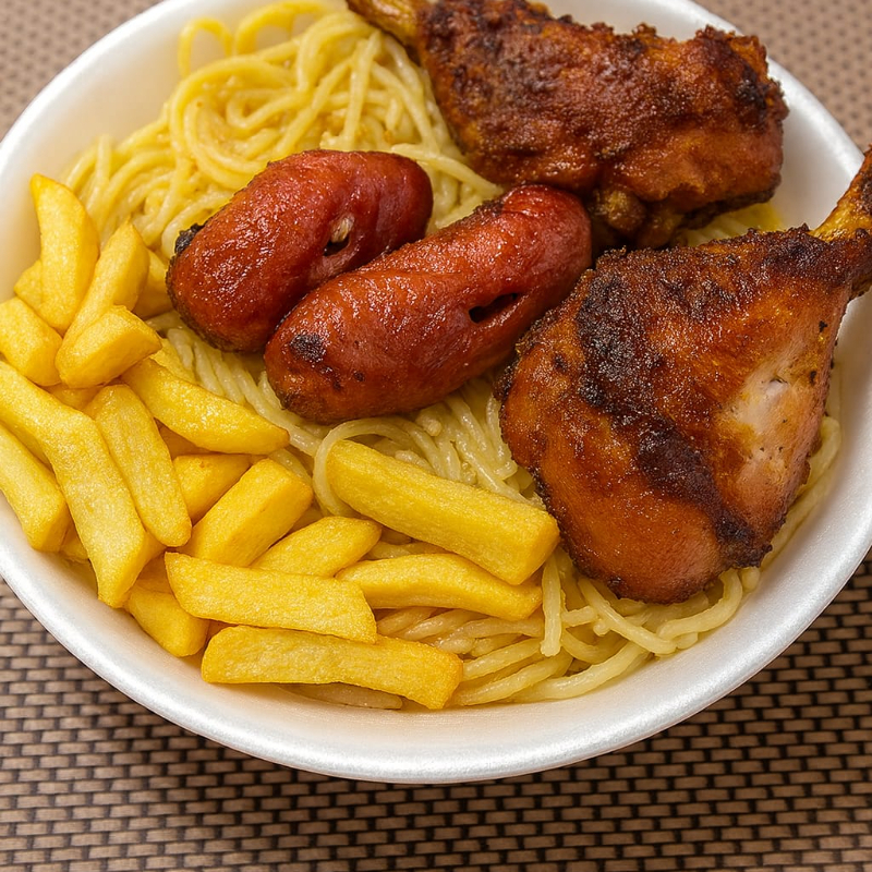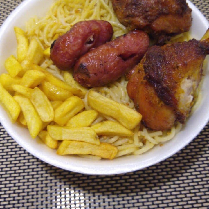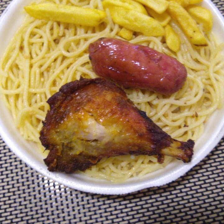 Macarrão alho e óleo, Fritas, 2 Coxas de Frango e 2 Linguiça.