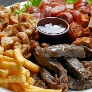 (+-700gr).calabresa acebolada, fritas, arroz, feijão e farofa.
