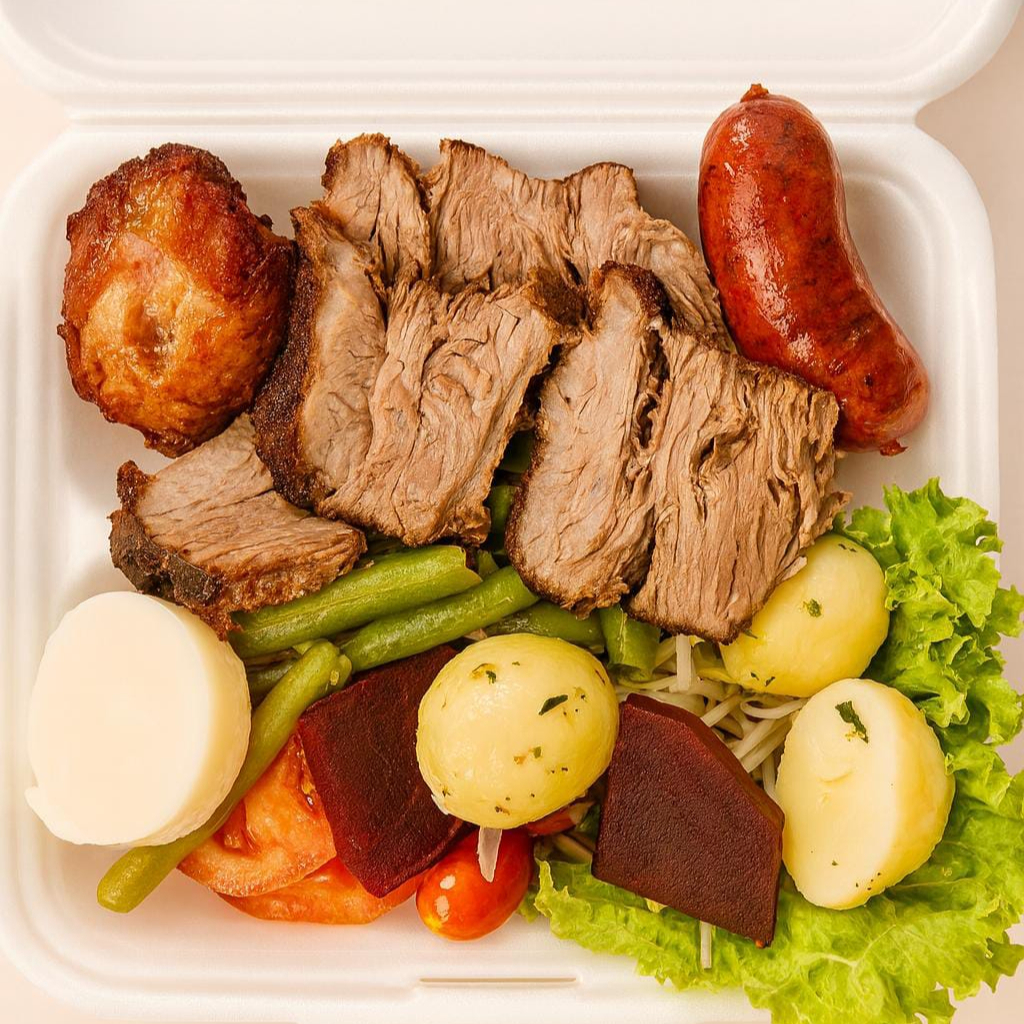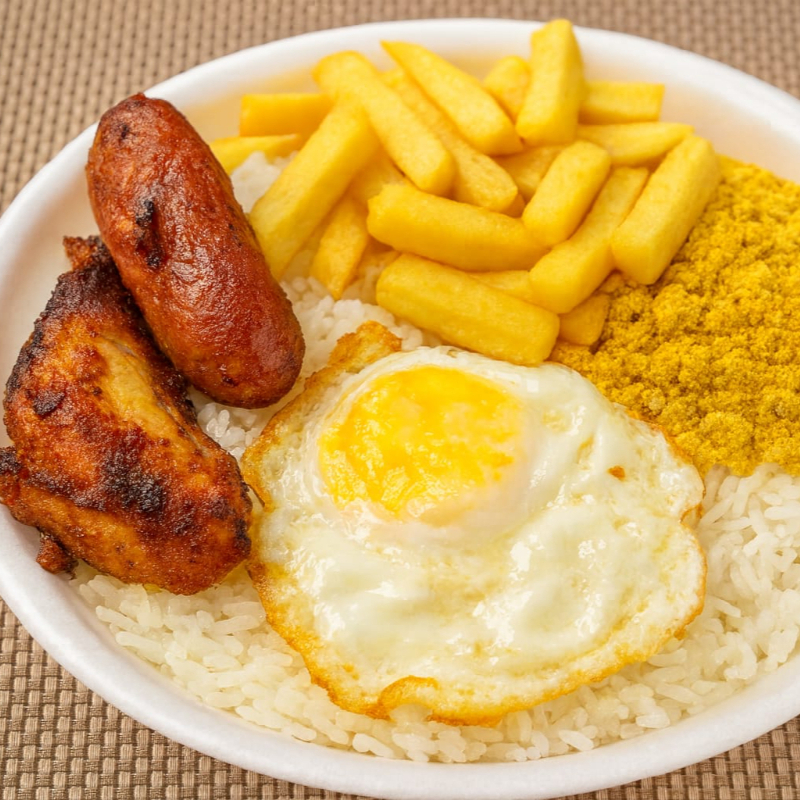 1 Coxa de Frango, 1 Linguiça, Fritas, 1 Ovo Frito, Arroz, Feijão e Farofa.