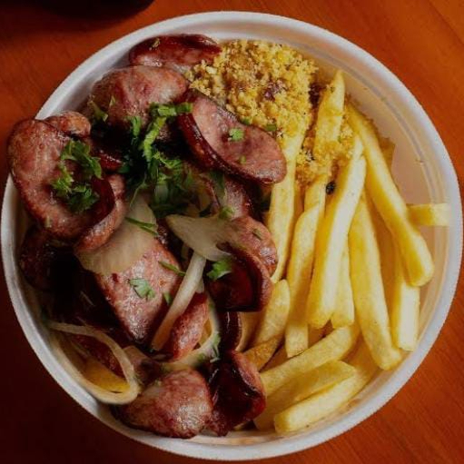 Calabresa Acebolada, Fritas, Arroz, Feijão e Farofa.