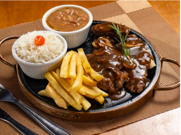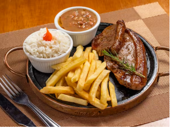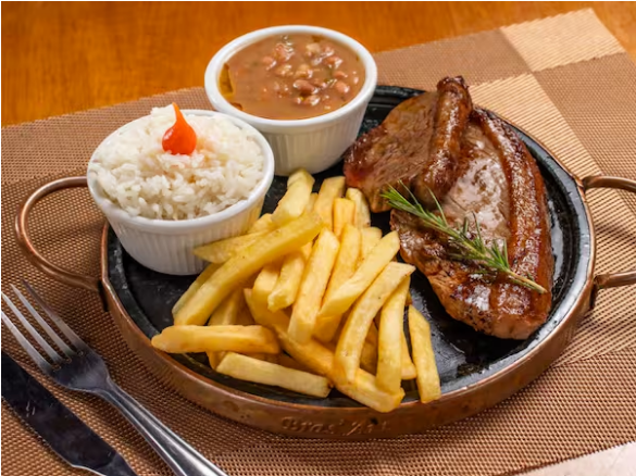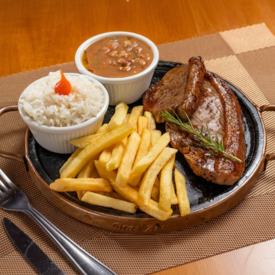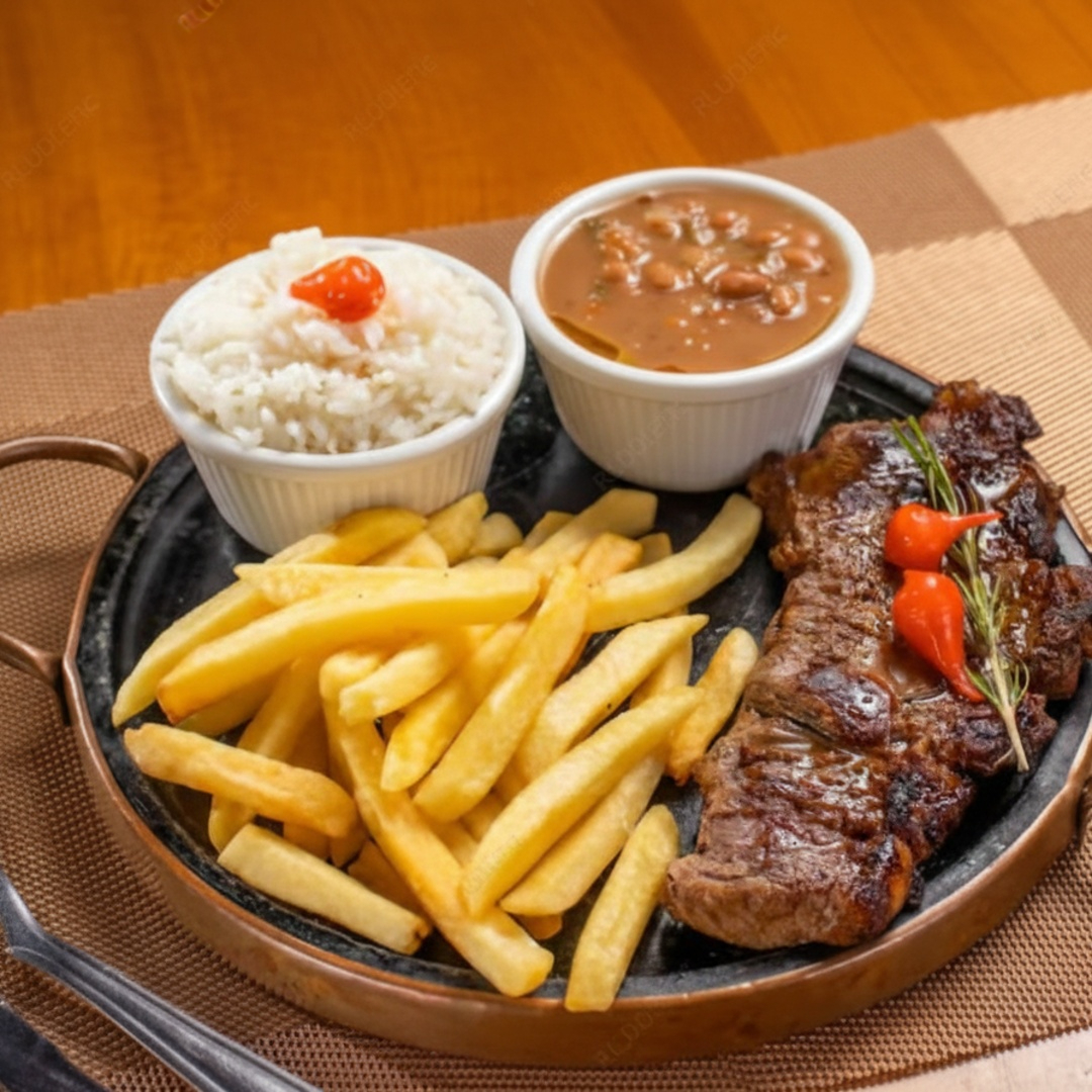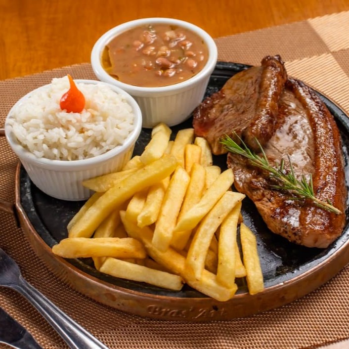 2 pedaços de picanha super suculenta, arroz branco, fritas e feijão. Um prato que você não irá se arrepender de comer!