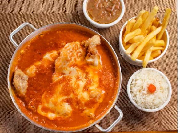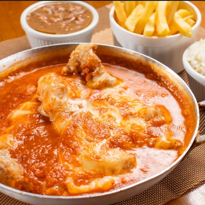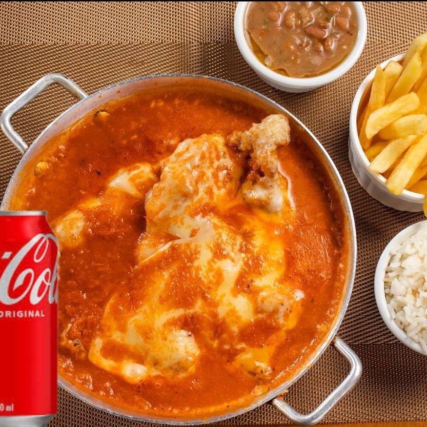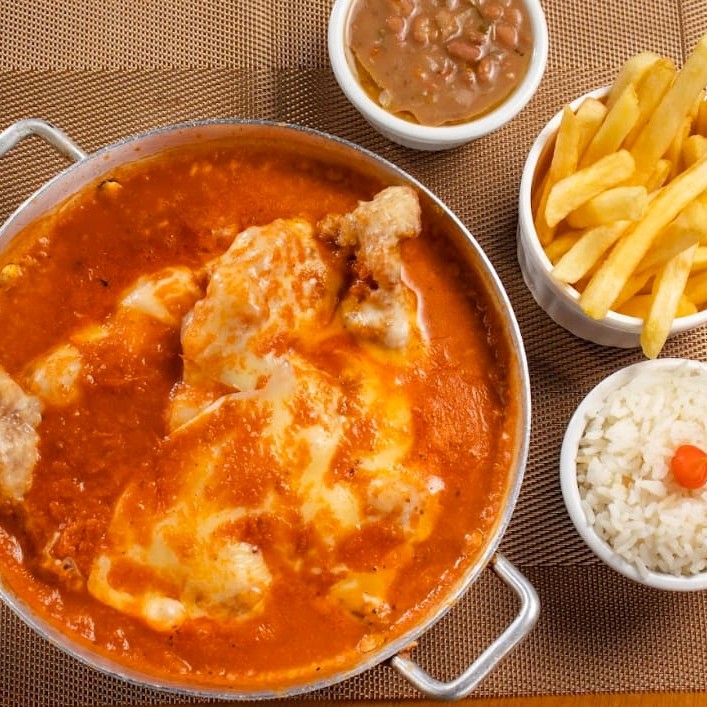 Delicie-se com nosso renomado 'Frango à Parmegiana', um destaque em nossa categoria 'Pratos Saborosos'. Com uma combinação perfeita de sabores, este prato traz um frango suculento e generosamente revestido com um molho de tomate intensamente saboroso e um queijo parmesão finamente ralado, derretido na medida certa. Acompanha arroz branco soltinho, um feijão deliciosamente temperado e batatas frita