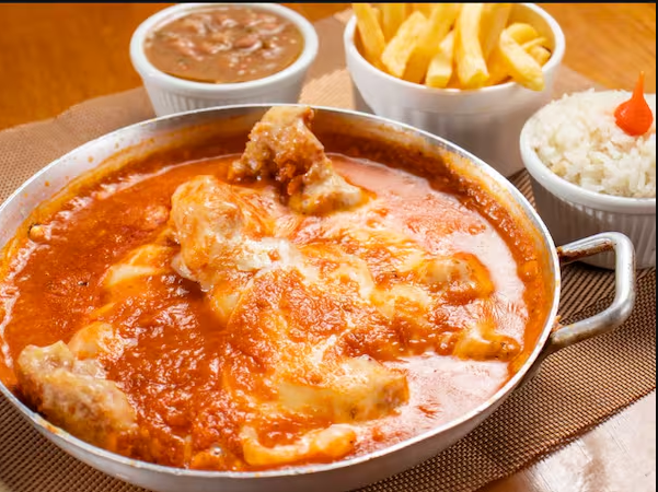 A 'Contra à Parmegiana' é um dos nossos 'Pratos Saborosos' que vai fazer você se apaixonar à primeira garfada. Este prato suntuoso, meticulosamente preparado por nossos chefs especializados, apresenta suculentos pedaços de contrafilé, cobertos com uma camada generosa de queijo parmesão divinamente derretido. A textura aveludada do queijo, combinada com a carne tenra e saborosa, cria uma sinfonia d
