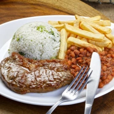 Bife acebolado acompanhado de arroz, feijão, farofa,e batata frita