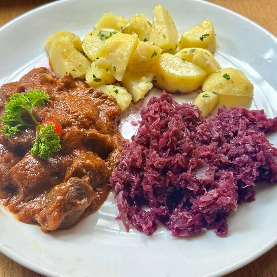 Ensopado Hungaro De Carnes Com Especiarias, Acompanhado De Batatas Cozidas E Repolho Roxo Ao Vinho.