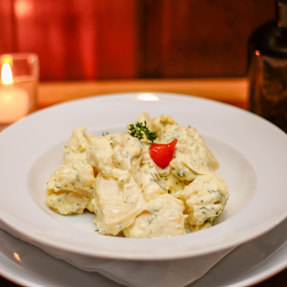 Salada especial de batatas com molho a base de cream cheese, maionese e creme de leite.