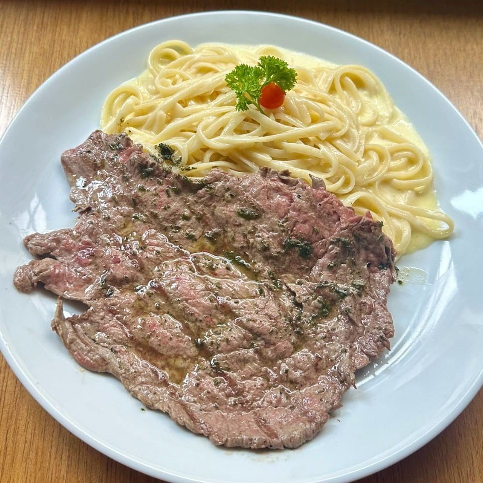 Paillard De Filé Mignon Angus Grelhado E Fettuccine Com Molho À Base De Manteiga, Parmesão E Creme De Leite.