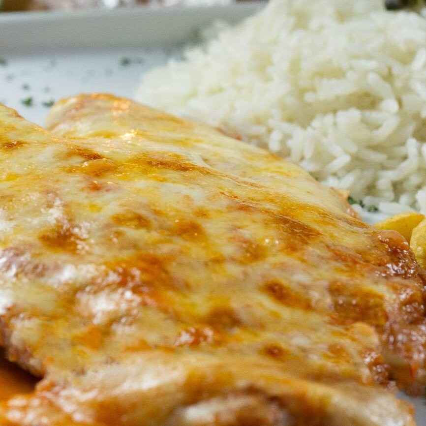 Filet Mignon Angus Á Milanesa Gratinado Ao Molho Sugo E Mussarela, Acompanha Espaguete Ao Molho Sugo Ou Arroz E Fritas.