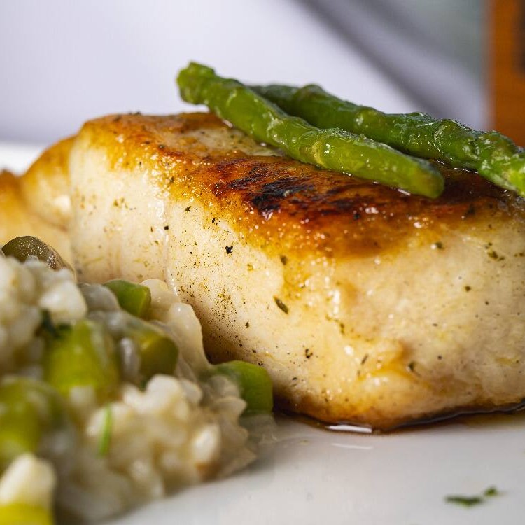 Filé De Robalo Grelhado Em Azeite Italiano E Risoto De Aspargo.