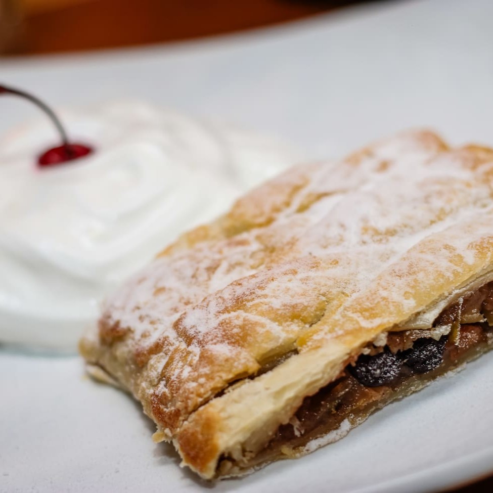 Strudel Folhado E Recheado Com Maçãs E Canela, Acompanha Chantilly.