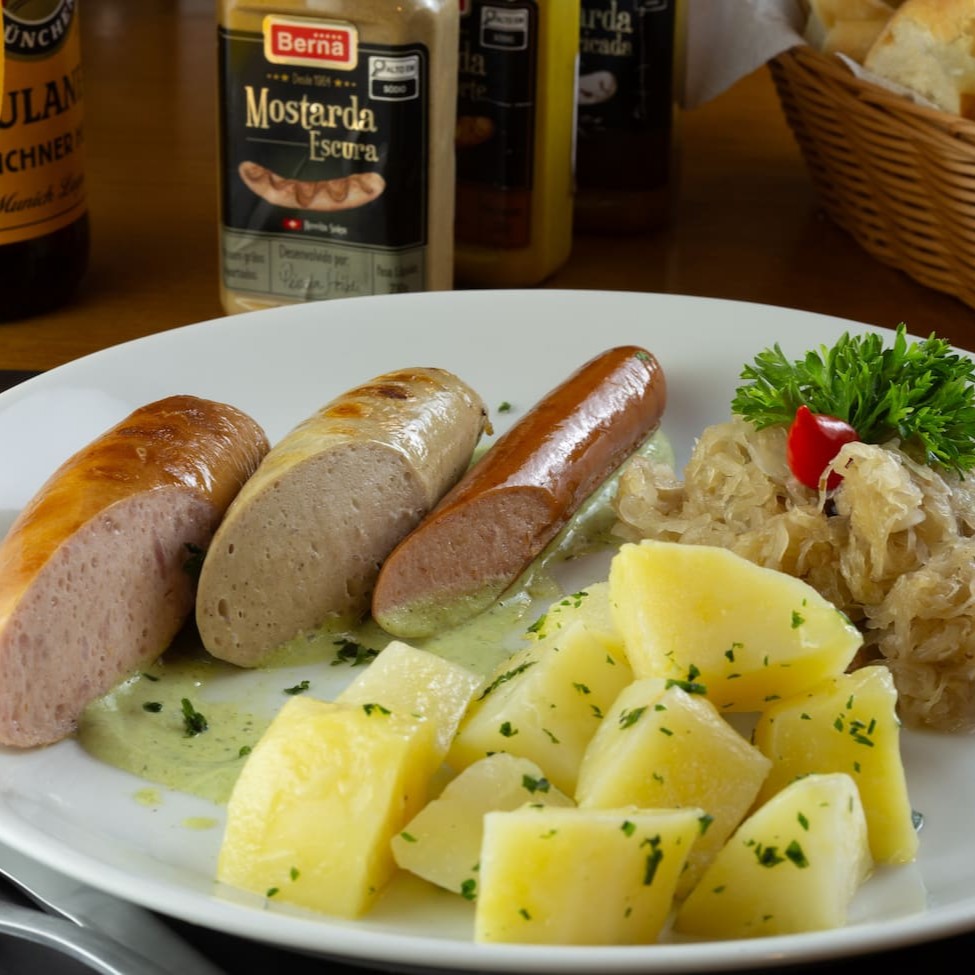 Salsicha Branca Kalbsbratwurst, Salsichão Schüblige Debreziner, Salsinha Frankfurt, Chucrute, Batatas Cozidas, Molho Grüne E Vagem Holandesa.