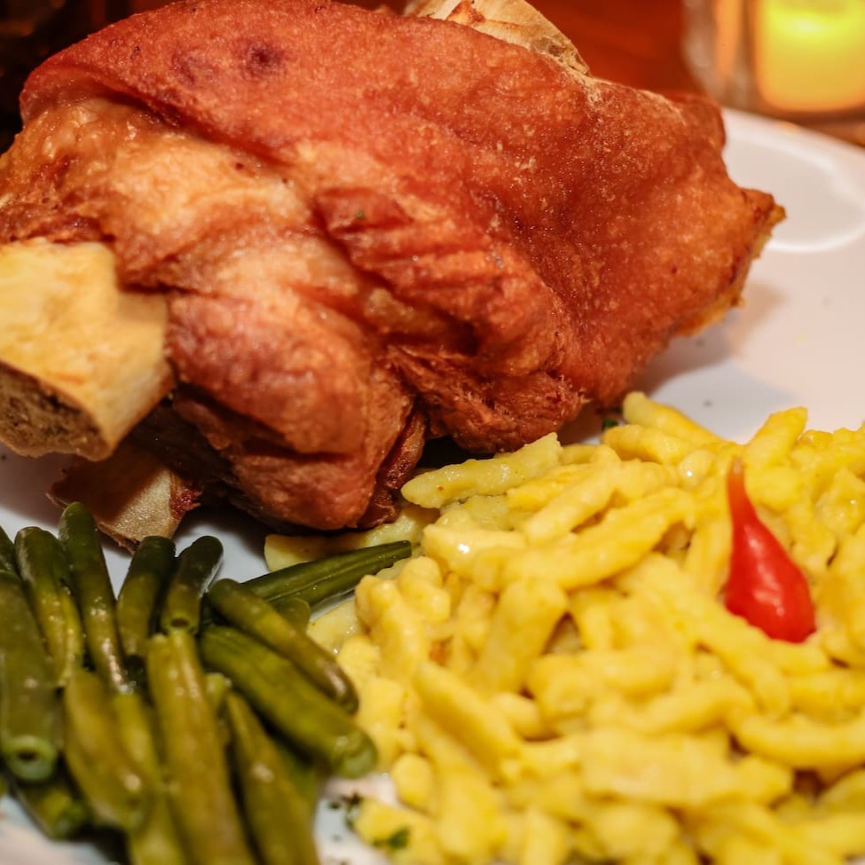 Joelho De Porco Crocante E Suculento Por Dentro, Com Spatzle E Vagem Holandesa.
