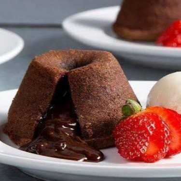 Bolo Quente Com Recheio Cremoso De Chocolate, Acompanha Sorvete De Creme E Farofa De Biscoito Crocante.