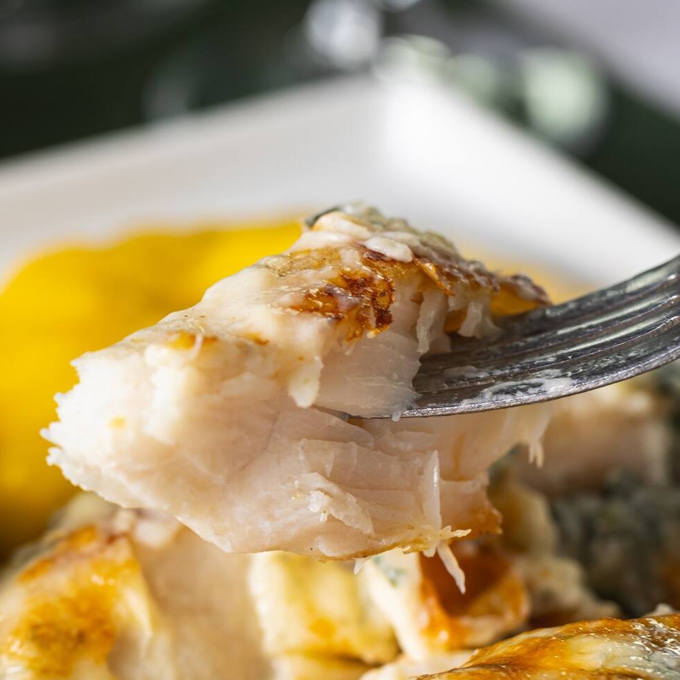 Peixe Saint Peter Preparado À Moda Fiorentina, Com Espinafre, Molho Branco, Vinho Branco E Azeite De Oliva, Acompanha Purê De Mandioquinha E Arroz.