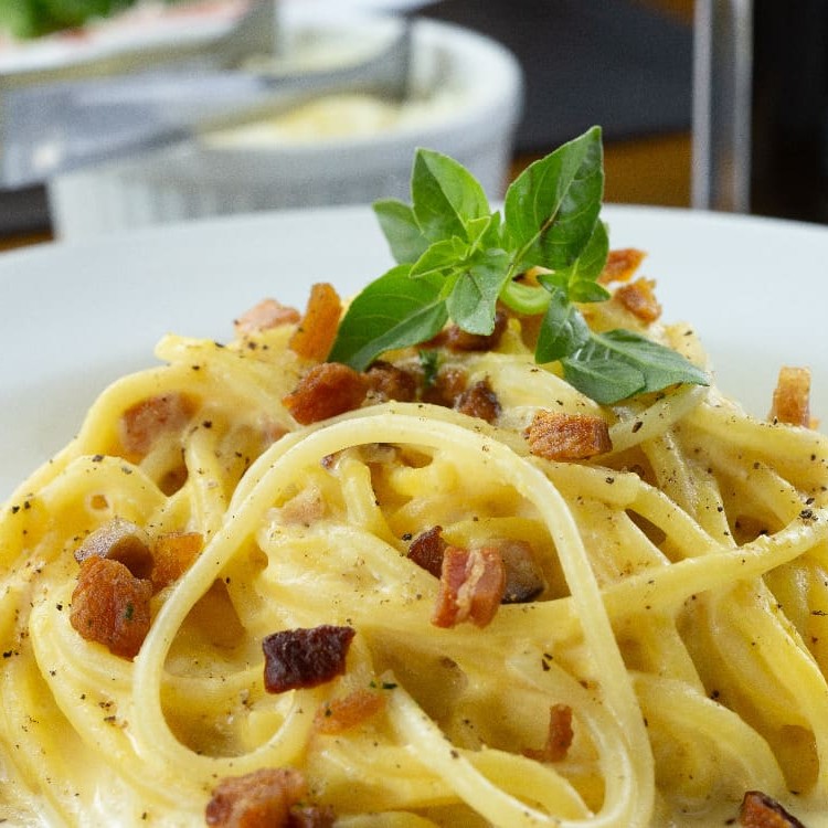 Com Bacon, Creme De Ovos, Queijo Parmesão E Pimenta Do Reino.