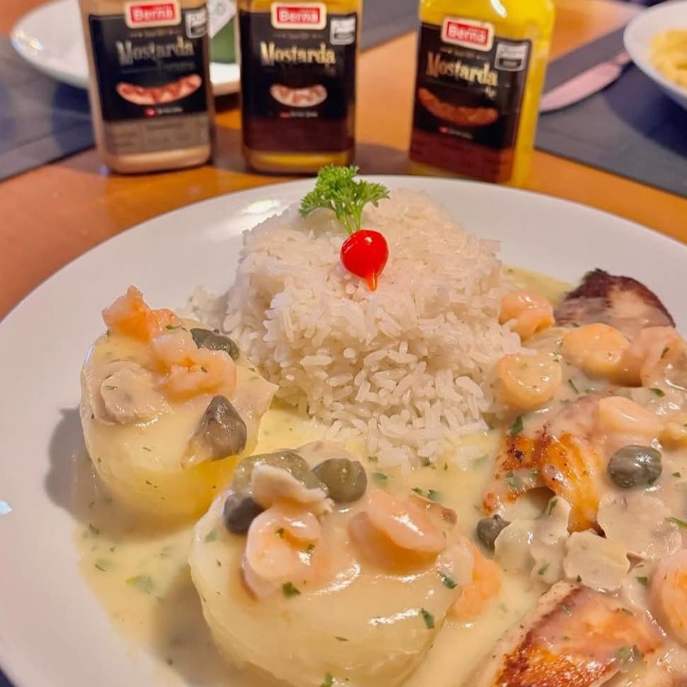 Peixe Saint Peter Grelhado Com Um Molho À Base De Vinho Branco, Camarão, Alcaparras, Champignon E Manteiga, Acompanha Arroz Branco E Batatas Cozidas.
